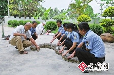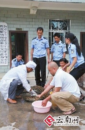 幫巨蟒清洗完身體后,民警當場為其體檢:身長3.7米,腹圍粗為55厘米,重達25公斤。經(jīng)西雙版納傣族自治州林業(yè)局野生動物保護站獸醫(yī)師許定澤鑒定,這條巨蟒屬于國家一級保護野生動物的雌性金花蟒,年齡約20歲左右。根據(jù)蟒蛇約35歲左右的壽命推算,其應(yīng)該正處于盛年期。據(jù)許定澤介紹,這樣大的金花蟒,實屬罕見。(戴振華 常宗波)