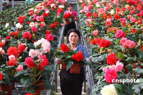 6月22日,在北京草橋楊鎮(zhèn)花卉基地一位花卉工人正在手捧朝鮮“金正日花”從海棠花中走過。據(jù)草橋基地負(fù)責(zé)人介紹“金正日花”屬于海棠科多年生球根花,是日本花卉專家加茂元照經(jīng)過多年研究培育出來的。在1988年送給朝鮮領(lǐng)導(dǎo)人金正日,作為領(lǐng)袖46歲生日的禮物,并以金正日命名。民眾可以在今年9月26日召開的第七屆中國花卉博覽會(huì)上一睹它的芳容。為了確!敖鹫栈ā蹦茉诨ú⿻(huì)上如期盛開,楊鎮(zhèn)草橋基地專門從朝鮮聘請(qǐng)了3名專業(yè)技術(shù)人員,他們對(duì)“金正日花”的生長溫度、適度控制非常嚴(yán)格,給花澆水、施肥都要按照嚴(yán)格的標(biāo)準(zhǔn)執(zhí)行。目前,“金正日花”長勢(shì)喜人。中新社發(fā) 富田 攝