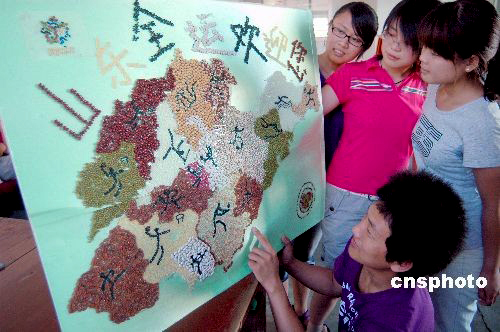 6月22日,為迎接第十一屆全運(yùn)會(huì),山東聊城大學(xué)生命科學(xué)學(xué)院生物踐行者協(xié)會(huì)的5名大學(xué)生以山東省地圖為模板,利用黃瓜、香菜、綠豆、大米等12種種子為素材,制作成全運(yùn)會(huì)地圖。地圖上用黑米拼出了山東每個(gè)城市所承辦比賽項(xiàng)目的標(biāo)志,并用紅、黃、黑、白四色種子拼寫(xiě)了“山東全運(yùn)歡迎您”的標(biāo)語(yǔ)。中新社發(fā) 張振祥 攝