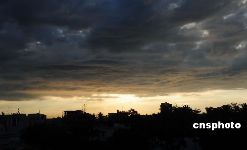 6月26日早晨5時(shí),2009年第4號(hào)熱帶風(fēng)暴“浪卡”(NANGKA)的中心位于東沙島偏南方大約220公里的南海東北部海面上,中心附近最大風(fēng)力有8級(jí)(20米/秒)。預(yù)計(jì),風(fēng)暴中心將以每小時(shí)15-20公里的速度向西北方向移動(dòng),將于6月26日夜間到27日上午在廣東惠來到珠海一帶沿海登陸,登陸后強(qiáng)度迅速減弱。中新社發(fā) 蒙鐘德 攝