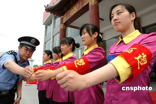 2009年7月9日,山東首支全運(yùn)會(huì)酒店女子巡邏隊(duì)在淄博周村北郊鎮(zhèn)成立。當(dāng)日是第十一屆全國(guó)運(yùn)動(dòng)會(huì)倒計(jì)時(shí)第99天,來(lái)自山東淄博周村區(qū)的10名酒店女子在北郊派出所民警的帶領(lǐng)下開(kāi)始“上崗”巡邏。據(jù)悉,全運(yùn)會(huì)期間,她們除擔(dān)負(fù)酒店周邊治安巡邏任務(wù)外,還負(fù)責(zé)救援受困游客和景區(qū)防火滅火等工作。中新社發(fā) 梁寶海 攝