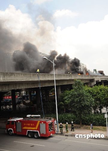 7月12日9時(shí)50時(shí)許,廣州市環(huán)城高速東圃路段,兩車(chē)相撞燃燒。車(chē)子燃燒的火苗有3米多高,該市環(huán)城高速東圃路段同方向車(chē)輛被堵近5公里長(zhǎng)。據(jù)高速橋下一位洗車(chē)師傅說(shuō),兩車(chē)是同相行駛,相撞時(shí)間大概是凌晨3點(diǎn)左右,先是一輛貨車(chē)燒著了,到上午9時(shí)許,另一車(chē)接著燃燒。10時(shí)59分,消防車(chē)趕到事發(fā)現(xiàn)場(chǎng)展開(kāi)援救。截止發(fā)稿時(shí)間,大火已被撲滅,人員傷亡情況正在調(diào)查中。中新社發(fā) 陸建東 攝