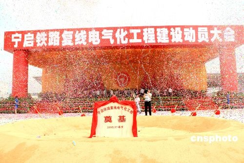7月14日,寧啟鐵路復(fù)線電氣化工程建設(shè)動員大會在江蘇省泰州市泰州火車站舉行。國家鐵道部部長劉志軍、江蘇省委書記梁保華、省長羅志軍,上海鐵路局局長安路生以及泰州市委書記張雷等出席。寧啟線路全長約268.3公里,項目總投資139億元,工期3年。建成后南京至南通運行時間將從3小時50分縮短至1小時50分。圖為鐵道部、江蘇省有關(guān)領(lǐng)導(dǎo)共同為工程奠基。中新社發(fā) 崔佳明 攝