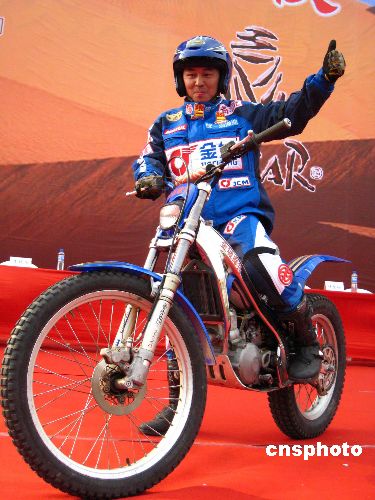 12月8日下午,中國首位摩托車手曹魯征戰(zhàn)2008年達(dá)喀爾拉力賽出征發(fā)車儀式在南京白馬公園舉行。今年30歲的曹魯曾先后獲得全國摩托車越野技巧賽冠軍、第二屆中國沙漠環(huán)塔拉力賽摩托車組總冠軍等榮譽(yù)。這次曹魯成為第一位摩托車手代表中國參加2008年1月5日發(fā)車的第30屆巴黎--達(dá)喀爾拉力賽,實現(xiàn)了他個人和中國摩托車界的夢想。中新社發(fā) 谷昌旺 攝