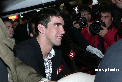 1月10日,在2008北京奧運(yùn)會(huì)上奪得8枚金牌的美國游泳選手菲爾普斯(michael phelps),抵達(dá)北京首都國際機(jī)場(chǎng)。此次他將為一家汽車廠商進(jìn)行代言活動(dòng),并拍攝宣傳片,工作之余,他還將到自己創(chuàng)造輝煌的國家游泳中心“水立方”參觀。中新社發(fā) 杜洋 攝