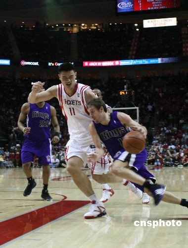 當(dāng)?shù)貢r(shí)間2月11日,火箭隊(duì)在休斯頓豐田中心以94-82擊敗阿帥舊部——聯(lián)盟倒數(shù)第一的國(guó)王,贏得了全明星賽前的最后一場(chǎng)比賽。姚明全場(chǎng)貢獻(xiàn)了24分18個(gè)籃板,均為全場(chǎng)最高。中新社發(fā) 歐文 攝