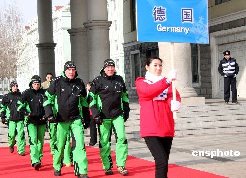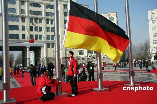 2月14日上午10時,第24屆世界大學(xué)生冬季運動會德國體育代表團歡迎儀式暨德國體育代表團升旗儀式在黑龍江大學(xué)大運村升旗廣場舉行。大運村執(zhí)行村長張政文、村長助理張曉光以及德國代表團團長羅蘭·約希姆一行6人出席了此次歡迎儀式。這是大運村首次為國外代表團舉行的歡迎儀式。中新社發(fā) 姚庭山 攝