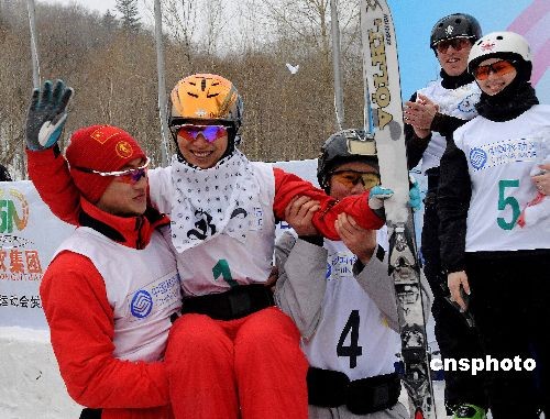 2月24日,第24屆世界大學(xué)生冬季運(yùn)動會在哈爾濱亞布力滑雪場進(jìn)行自由式滑雪空中技巧混合團(tuán)體賽。中國隊(duì)派出男女個(gè)人賽的冠軍賈宗洋和李妮娜以及男隊(duì)的劉忠慶三人出戰(zhàn),三人均完美地完成動作,最終以總分335.24獲得冠軍。 中新社發(fā) 鄭宇鈞 攝