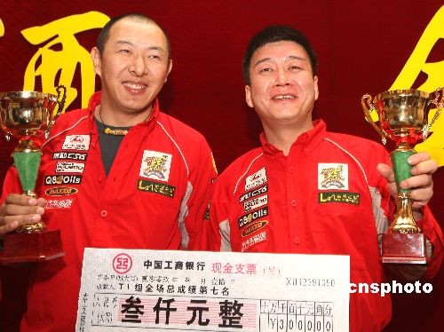3月10日,經(jīng)過三天的激烈角逐,“金馬杯”第六屆漠河冰雪汽車越野賽暨全國汽車越野系列賽,在黑龍江省漠河縣境內(nèi)中俄界江黑龍江攝氏零下20多度的自然冰雪江面上結(jié)束,長豐汽車華南虎車隊(duì)劉斌(右)在三天的比賽中兩次奪得“飛車王”獎(jiǎng),最終獲得全場“飛車王”獎(jiǎng)。中新社發(fā) 趙振清 攝