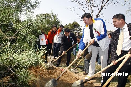 4月4日,首都第25個(gè)義務(wù)植樹日,北京林業(yè)大學(xué)以“建國60周年”和“五四”運(yùn)動(dòng)90周年為契機(jī)開展“為華夏播綠,向祖國獻(xiàn)禮”首都大學(xué)生第十三屆“綠橋”活動(dòng)暨第三屆全國青少年綠色長(zhǎng)征接力活動(dòng)。開幕儀式上首都大學(xué)生聘請(qǐng)王治郅、林依倫、阿寶、張湘祥等文藝、體育明星擔(dān)任第八屆首都大學(xué)生“綠色志愿大使”暨“綠色長(zhǎng)征形象大使”。圖為王治郅首都義務(wù)植樹日上植樹。中新社發(fā) 鄭雄增 攝