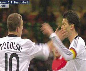 2比0,德國隊擊敗威爾士,世界杯出線形勢大好。不過勝利也不能讓所有人都開心,為德國隊首開紀錄的隊長巴拉克就很郁悶,比賽中他被隊友波多爾斯基扇了一記耳光。“他當時不是很認同我的看法,但在球場上就該聽從我的意見,而不是用手來攻擊我!辟惡蟀屠藨嵟卣f。