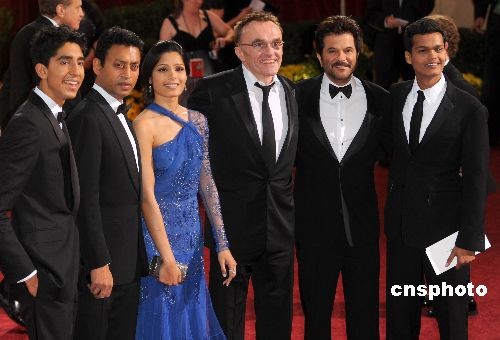 第八十一屆奧斯卡電影金像獎(jiǎng)?lì)C獎(jiǎng)典禮二月二十二日晚在好萊塢柯達(dá)劇場(chǎng)舉行。印度“平民”演員出演的《貧民富翁》如愿以償?shù)貥s獲年度最佳影片大獎(jiǎng),成為當(dāng)晚最大贏家。圖為該片主要演員走過紅地毯。中新社發(fā) 張煒 攝