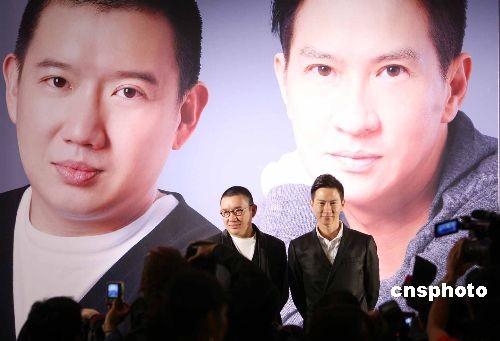 三月十二日,香港英皇娛樂集團在日航酒店舉行記者會,宣布影星張家輝(右)、杜汶澤加盟英皇電影。中新社發(fā) 洪少葵 攝