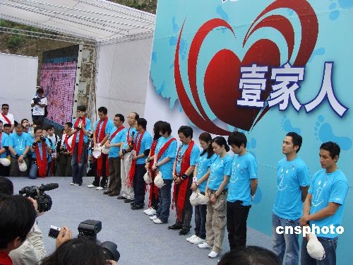 2009年5月10日,在“5·12”汶川大地震震中映秀鎮(zhèn),李連杰攜吳彥祖、林心如、鐘麗緹、柯以敏、鐘漢良、沈星、張杰等眾多明星義工,開展中國紅十字會壹基金主辦的“壹家人,壹起走”大型戶外援建災(zāi)區(qū)公益活動(dòng)。來自各地的300多名媒體記者、志愿者和明星們一同走完了2公里的災(zāi)區(qū)路。在半小時(shí)的路程中,完成了李連杰成立緊急救援聯(lián)盟等許多心愿,眾明星們的表現(xiàn)令人感動(dòng)。 壹基金是由國際巨星李連杰發(fā)起的立足于中國的國際性公益組織,分別在中國大陸及香港地區(qū)、美國和新加坡設(shè)立了辦事機(jī)構(gòu)。在中國大陸地區(qū),壹基金與中國紅十字總會合作,成立了“計(jì)劃”,致力于傳播公益文化,搭建公益平臺,以推動(dòng)全國公益事業(yè)的發(fā)展。中新社發(fā) 善平 攝