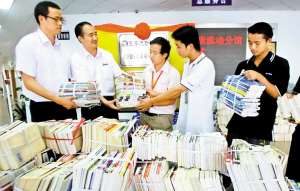 昨日上午,(深圳)寶安區(qū)圖書館富士康流動(dòng)分館揭牌儀式在寶安區(qū)圖書館大堂內(nèi)舉行,揭牌儀式現(xiàn)場(chǎng)堆放著1萬冊(cè)圖書,這些圖書都是準(zhǔn)備送往富士康流動(dòng)分館的觀瀾廠區(qū)。