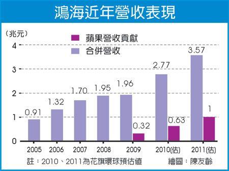 張凱偉更預(yù)估,蘋果占鴻海營收貢獻(xiàn),將從2009年的3200億元成長至2010年的6300億元,2011年則上看1兆元,因此,除非競爭對手能將生產(chǎn)蘋果產(chǎn)品的員工人數(shù)拉高3倍,否則將難以撼動鴻海的主導(dǎo)地位。