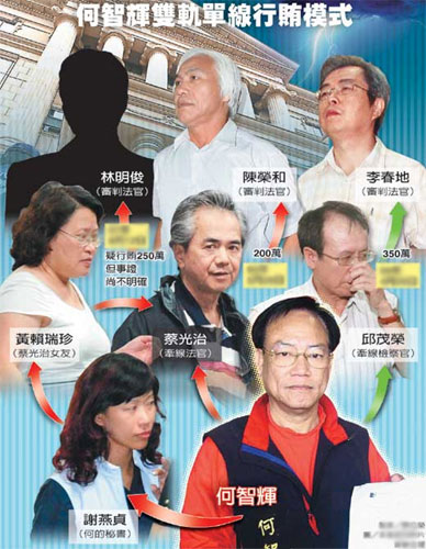 何智輝與高院法官蔡光治是多年好友,何智輝的秘書謝燕貞和蔡光治的女友黃賴瑞珍更是20多年前幼教工作的同事;板橋地檢署主任檢察官邱茂榮則因曾在苗栗地檢署做過主任檢察官,與當(dāng)過苗栗縣長的何智輝早已熟識。何智輝于是運用兩個女人當(dāng)中間人,再利用司法官之間同學(xué)、同事情誼,各自對承審法官行賄。