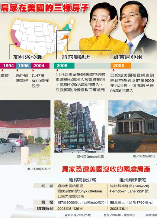 依美方資料,扁家在紐約市近曼哈坦八大道鬧區(qū)的豪華公寓,售價一百五十七萬五千美元(約臺幣五千萬元),在○八年五月二十九日購買;在弗州要價五十五萬美元(約臺幣一千七百六十萬元)的獨棟住宅,在同年六月購得。
