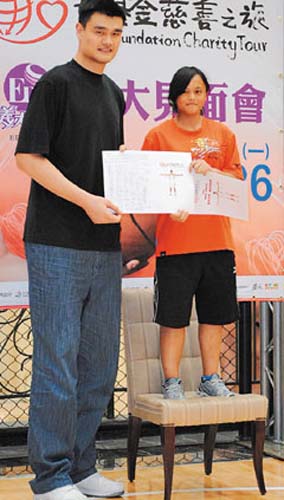 姚明在“2010姚基金慈善之旅”主辦單位安排下,和八八水災(zāi)災(zāi)區(qū)148名高雄縣中學(xué)生見面,學(xué)生們看到姚明穿著牛仔褲、輕便打扮出現(xiàn)在義大世界購物中心,全場尖叫聲不斷。