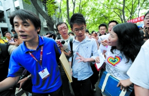 昨日北大五四路上迎來(lái)了一群新鮮的面孔,而李戡絕對(duì)是其中的“超級(jí)明星”。早上8點(diǎn),兩岸三地的記者就在經(jīng)濟(jì)學(xué)院報(bào)名處“蹲點(diǎn)”。10點(diǎn)左右,身材清瘦、穿著白底黑條紋襯衫的李戡終于現(xiàn)身,面對(duì)媒體的圍追堵截,他應(yīng)對(duì)大方得體,承認(rèn)上北大是受父親的影響。前來(lái)送行的母親則希望媒體的關(guān)注只限于近幾日,開學(xué)后能讓孩子平靜安心地學(xué)習(xí)。