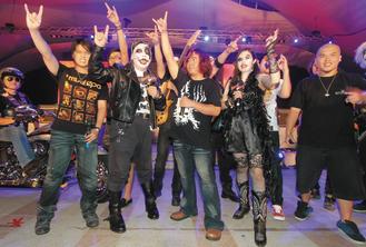 昨晚活動(dòng)記者會(huì),由春吶創(chuàng)辦人Wade所組、來(lái)自蘇格蘭的Aurora樂(lè)團(tuán)開(kāi)場(chǎng),接著是由團(tuán)員全化上嚇人尸妝的“搖滾臺(tái)中金屬魂”咆哮震撼登場(chǎng),演唱由在地金屬10團(tuán)共同創(chuàng)作的主題曲“搖滾臺(tái)中”。隆隆重金屬樂(lè)聲中,胡志強(qiáng)化身?yè)u滾客、跨坐百萬(wàn)哈雷摩托車(chē)現(xiàn)身。