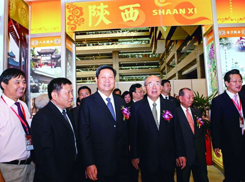 當(dāng)日上午九時(shí)許,在悠揚(yáng)古樸的秦腔曲牌聲中,“陜西風(fēng)情節(jié)”在臺(tái)北世貿(mào)中心拉開帷幕,近百家企業(yè)的300多種產(chǎn)品吸引了諸多臺(tái)灣民眾。趙正永、景俊海和吳伯雄以及臺(tái)灣商業(yè)總會(huì)理事長(zhǎng)張平沼等在參觀展覽之后,出席了活動(dòng)開幕式。趙正永在致辭中說(shuō),兩岸經(jīng)濟(jì)具有很強(qiáng)的互補(bǔ)性,不斷加強(qiáng)交流與合作,對(duì)于應(yīng)對(duì)國(guó)際金融危機(jī)和促進(jìn)經(jīng)濟(jì)持續(xù)發(fā)展具有重要意義。隨著“三通”的實(shí)現(xiàn),陜臺(tái)兩地的交流合作領(lǐng)域不斷擴(kuò)大、態(tài)勢(shì)越來(lái)越好。為進(jìn)一步凝聚共識(shí)、互惠發(fā)展,在臺(tái)灣有關(guān)方面的大力支持下,我們赴臺(tái)舉辦包括“陜西風(fēng)情節(jié)”等許多活動(dòng)在內(nèi)的“2010臺(tái)灣陜西周”,相信這次活動(dòng)會(huì)使臺(tái)灣企業(yè)和民眾更多地了解陜西,推動(dòng)陜臺(tái)合作向更高層次發(fā)展。吳伯雄在致辭中對(duì)我省舉辦臺(tái)灣陜西周表示熱烈歡迎,他說(shuō),秦中自古帝王州,陜西是中華文化的發(fā)祥地,工業(yè)基礎(chǔ)較好,資源豐富,有眾多的高校和科研單位,與臺(tái)灣有著良好的往來(lái),臺(tái)灣陜西周文化交流、認(rèn)親拜友、科技聯(lián)盟的主題,都是與臺(tái)灣合作中非常重要的問(wèn)題,陜西也具備這樣的條件和基礎(chǔ),希望以這次活動(dòng)為新的契機(jī),不斷推動(dòng)陜臺(tái)合作向更多更寬的領(lǐng)域發(fā)展。作為陜西省政府高級(jí)經(jīng)濟(jì)顧問(wèn)的張平沼,以切身經(jīng)歷說(shuō)明了大陸與臺(tái)灣加強(qiáng)合作的重要性,表達(dá)了進(jìn)一步加強(qiáng)合作的愿望。