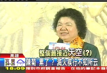 報道稱,盡管被批得滿頭包,陳菊還是照跑行程,29日下午和高雄縣長楊秋興同臺時,不但顯露疲態(tài),還有點語無倫次。道歉、勘災(zāi)、還得跑行程,陳菊只能用焦頭爛額來形容。