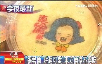 中新網(wǎng)10月9日電 據(jù)臺(tái)灣TVBS報(bào)道,臺(tái)灣“五都”選戰(zhàn)倒數(shù),朱立倫陣營(yíng)推出限量首賣的“車倫餅”,民眾瘋狂搶購(gòu)!朱立倫變身可愛(ài)造型的“乖乖倫”和“OPEN倫”等10幾種創(chuàng)意造型!朱立倫笑說(shuō),他最喜歡“張君倫”小妹妹造型,因?yàn)楹芟袼畠,很可?ài),他真舍不得把餅吃掉。