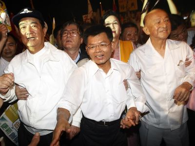 據(jù)報道,楊秋興17日上午成立競選總部,晚間在競選總部舉行晚會。宋楚瑜與前高雄縣長、“總統(tǒng)府”資政林淵源,在楊秋興夫婦陪同下,從臺下人群中被簇擁上臺。