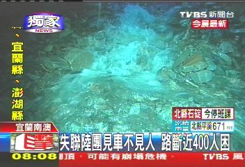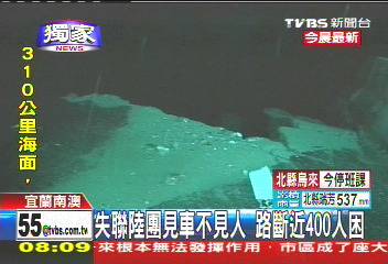中新網(wǎng)10月22日電 據(jù)臺(tái)灣TVBS報(bào)道,宜蘭大淹水,蘇花公路更是處處坍方,甚至傳出有大陸游客團(tuán)的游覽車受困。該媒體記者挺進(jìn)現(xiàn)場,只看到游覽車空車,人員不知去向,不知是否平安;臺(tái)九線大約115公里處,部分路段的路基完全被淘空,土石滑落一兩百米的山下,附近路面更變成小溪、不斷淹水。