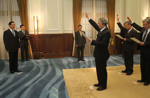 據(jù)報(bào)道,馬英九25日上午出席新任“司法院”、“考試院”政務(wù)人員宣誓典禮,并擔(dān)任監(jiān)誓。宣誓官員包括“司法院長(zhǎng)”賴(lài)浩敏、“副院長(zhǎng)”蘇永欽、“最高行政法院院長(zhǎng)”蔡進(jìn)田、“考試院考試委員”張明珠、“考試院考試委員”高永光、“司法院秘書(shū)長(zhǎng)”林錦芳、“公務(wù)人員保障暨培訓(xùn)委員會(huì)主任委員”蔡璧煌共7人。