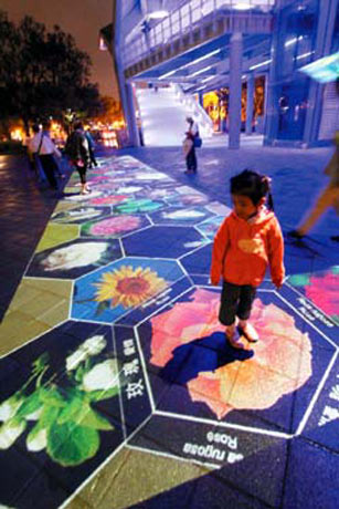 投影光雕有五個(gè)互動設(shè)計(jì),測試階段只展演“花語寄情”,一踩在投影花苞上,玫瑰、向日葵、茶花、梅花等花卉就會瞬間盛開,還會出現(xiàn)花卉信息,朵朵投影互動花海,恰與一旁地景花!罢婊ā毙纬捎腥Ρ。