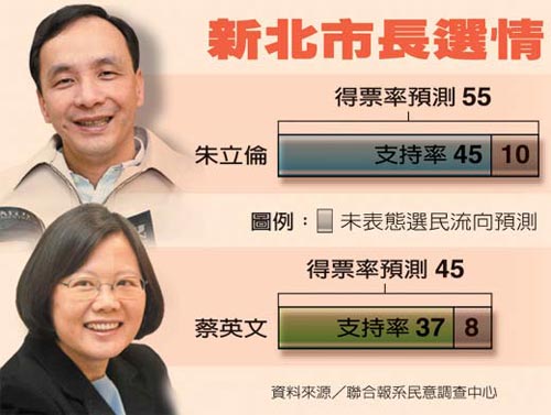 年底新北市長選戰(zhàn),將由民進黨蔡英文迎戰(zhàn)國民黨朱立倫。調(diào)查發(fā)現(xiàn),朱立倫目前獲得四成五選民支持,三成七力挺蔡英文。