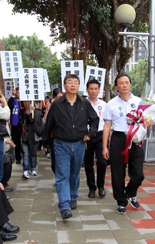 中新網(wǎng)11月9日電 據(jù)臺(tái)灣《聯(lián)合報(bào)》報(bào)道,國(guó)民黨“立委”邱毅及臺(tái)北市議員李新等人,8日率近百人到臺(tái)北地方法院丟雞蛋抗議,同時(shí)按鈴告發(fā)審判長(zhǎng)周占春枉法裁判,由臺(tái)北地檢署受理。