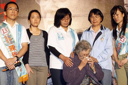 無獨(dú)有偶,“招妓”話題如影隨行的扁子陳致中,在其競選總部門口舉辦“來不及說再見,陳水扁坐監(jiān)惜別晚會”,為自己的選舉拉抬聲勢。晚會組織者露出口風(fēng):不排除讓扁媽當(dāng)眾下跪。雖然最終扁媽沒有下跪催票,但扁家人哭成一團(tuán)的場景仍就是綠營的一大妙招。