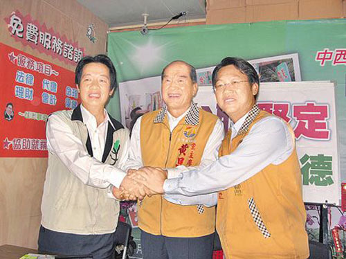 民進黨臺南市長候選人賴清德,在“臺聯(lián)黨”主席黃昆輝見證下,公開力挺“臺聯(lián)黨”中西區(qū)市議員候選人陳昌輝。 圖片來源:臺灣《中國時報》