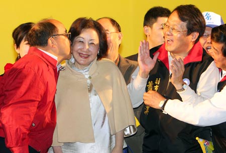 國民黨籍臺中市長候選人胡志強(qiáng)(左)27日在臺中市競選總部自行宣布當(dāng)選臺中市長,在群眾鼓舞下親吻、擁抱妻子邵曉鈴(左2),感謝她的支持與陪伴。“中央社”圖
