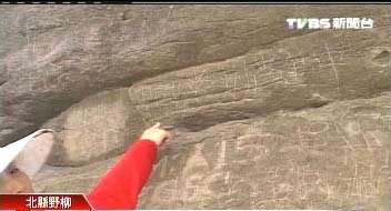 據(jù)臺灣TVBS報(bào)道,27日當(dāng)天有人在野柳地質(zhì)公園看到大批陸客,隨后就在陸橋旁的巖壁發(fā)現(xiàn)被刻上簡體字樣“中國常州趙根大”,還有一個(gè)常州同鄉(xiāng)“盧建中”也來插花,又聽到園區(qū)廣播“來自常州的旅客,請盡速集合”,直覺“趙根大”真有其人。地質(zhì)公園經(jīng)營業(yè)者湯錦惠無奈地說,要麻煩導(dǎo)游倡導(dǎo)不要破壞景觀。