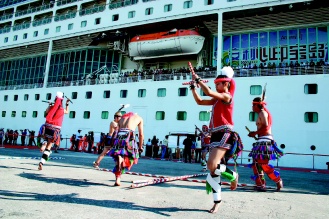 中新網(wǎng)3月17日電 據(jù)臺灣《聯(lián)合晚報(bào)》報(bào)道,大陸安利營銷精英團(tuán)17日上午搭郵輪“海洋神話號”抵達(dá)花蓮港,花蓮縣在港邊安排原住民舞蹈歡迎,大陸觀光客看得興高采烈。