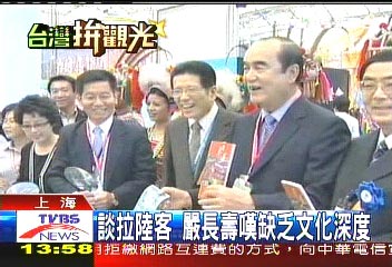 臺(tái)灣觀光協(xié)會(huì)要嚴(yán)長(zhǎng)壽帶領(lǐng)金門連江宜蘭花蓮到上海,營(yíng)銷臺(tái)灣旅游,面對(duì)先前北京喊出百萬人游臺(tái),嚴(yán)長(zhǎng)壽感嘆,光喊拉大陸客的口號(hào)不夠,臺(tái)灣拼觀光還是缺乏文化深度。