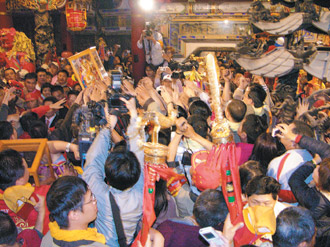 中新網(wǎng)3月26日電 據(jù)臺(tái)灣《聯(lián)合報(bào)》報(bào)道,大甲媽祖到新港繞境進(jìn)香,25日上午在奉天宮前廣場舉行祝壽大典,數(shù)萬信眾跪地虔誠膜拜為媽祖賀壽,數(shù)百米馬路擠得水泄不通。晚間大甲媽回駕,信眾爭相觸摸媽祖金身,場面熱鬧滾滾。