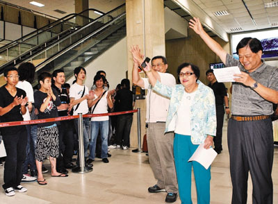 許榮淑踏進(jìn)入境大廳,立刻有掌聲為她加油,三重市黨部動員許多民眾接機,可是仔細(xì)一看,這一整群的支持者還真有殺氣,穿著打扮不是黑就是白,即使在室內(nèi)也要戴墨鏡,就像在拍香港古惑仔的電影,身上的刺青格外引人注目,唯一跟港版古惑仔不同的是,臺灣的熱血男兒們嚼著檳榔。這些支持者不但搭4輛游覽車來相挺,還帶著打扮清涼火辣的辣妹一同觀摩政治人物如何造勢。