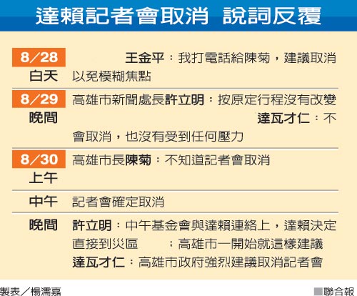 達(dá)賴記者會(huì)辦不辦成30日焦點(diǎn),陳菊30日上午受訪時(shí)還堅(jiān)稱記者會(huì)照舊,直到達(dá)賴方面表示取消后,才對(duì)外說“直赴災(zāi)區(qū)原就是她的建議行程”,引起外界質(zhì)疑是高雄市府事后“自圓其說”。