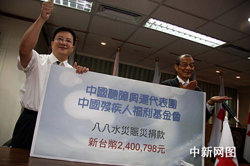 在簡短的捐贈儀式上,中國聽障奧運代表團團長賈勇表示,這次前來臺北參加第二十一屆聽障奧運會,借此機會,他代表中國聽障奧運代表團和中國殘疾人福利基金會,向“八八水災(zāi)”罹難的同胞們捐款。希望為受災(zāi)同胞加油,災(zāi)區(qū)重建工作盡快回復(fù)。同時希望擴大包括運動員在內(nèi)的兩岸交流,增進彼此了解,共同抗擊自然災(zāi)難。
