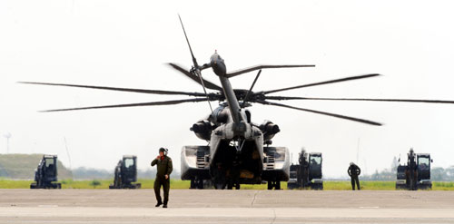 17日下午,美國一架編號(hào)546的MH-53E海龍掃雷直升機(jī)(非官方所指的CH-53E超級(jí)種馬運(yùn)兵直升機(jī)),先從停泊臺(tái)灣外海的“丹佛號(hào)”兩棲登陸補(bǔ)給艦(LPD-9)上飛抵臺(tái)南空軍基地。完成航線規(guī)劃協(xié)調(diào)后,海龍直升機(jī)今天上午將連同另三架美軍直升機(jī)先進(jìn)行地面探勘試飛后,再返回分趟吊掛小山貓進(jìn)入災(zāi)區(qū)協(xié)助救災(zāi)。