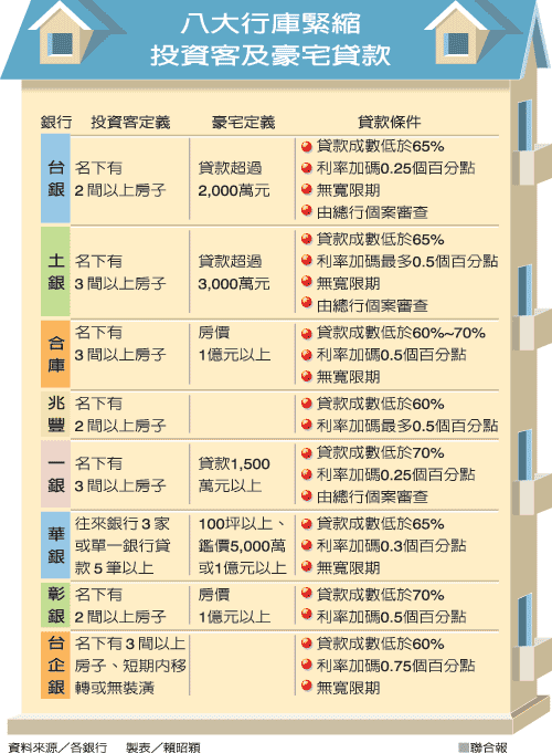 合作金庫董事長劉燈城說,上周已發(fā)文給營業(yè)單位,定義豪宅為超過一億元(新臺(tái)幣,下同)的房子,貸款成數(shù)都降為六成,和一般房貸的八成相比降了兩成,貸款利率也加碼0.5%,同時(shí)取消寬限期。至于投資客申請房貸,只要不是換屋,第二棟的貸款成數(shù)降為七成,并取消寬限期,第三棟的利率加碼0.5百分點(diǎn)。