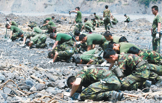 另外,在六龜鄉(xiāng)新開部落搜救的臺軍官兵,昨天趴在可能埋尸的土石流現(xiàn)場,用鼻子聞土壤中有無酸味,再用鏟子挖土,希望找到罹難者遺體,可惜尚無所獲,他們表示,“雖然很累,但為了罹難者也要拚下去。”