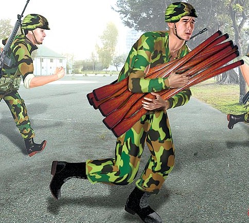 臺軍中尉排長以不服指揮為由惡整士兵,要他全副武裝,抱11把木槍出操。圖片來源:蘋果日報