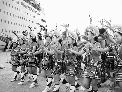13日,安利團(tuán)員乘坐的郵輪?炕ㄉ徃劭凇T绯7時(shí),已經(jīng)有花蓮原住民阿美族的姑娘小伙身著盛裝,在港口用歌聲和舞蹈歡迎大陸來(lái)的客人。