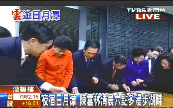 陳云林今天清晨6點(diǎn)多,先是邀約江丙坤共進(jìn)早餐,后來又漫步在日月潭湖畔,欣賞美麗的風(fēng)光。